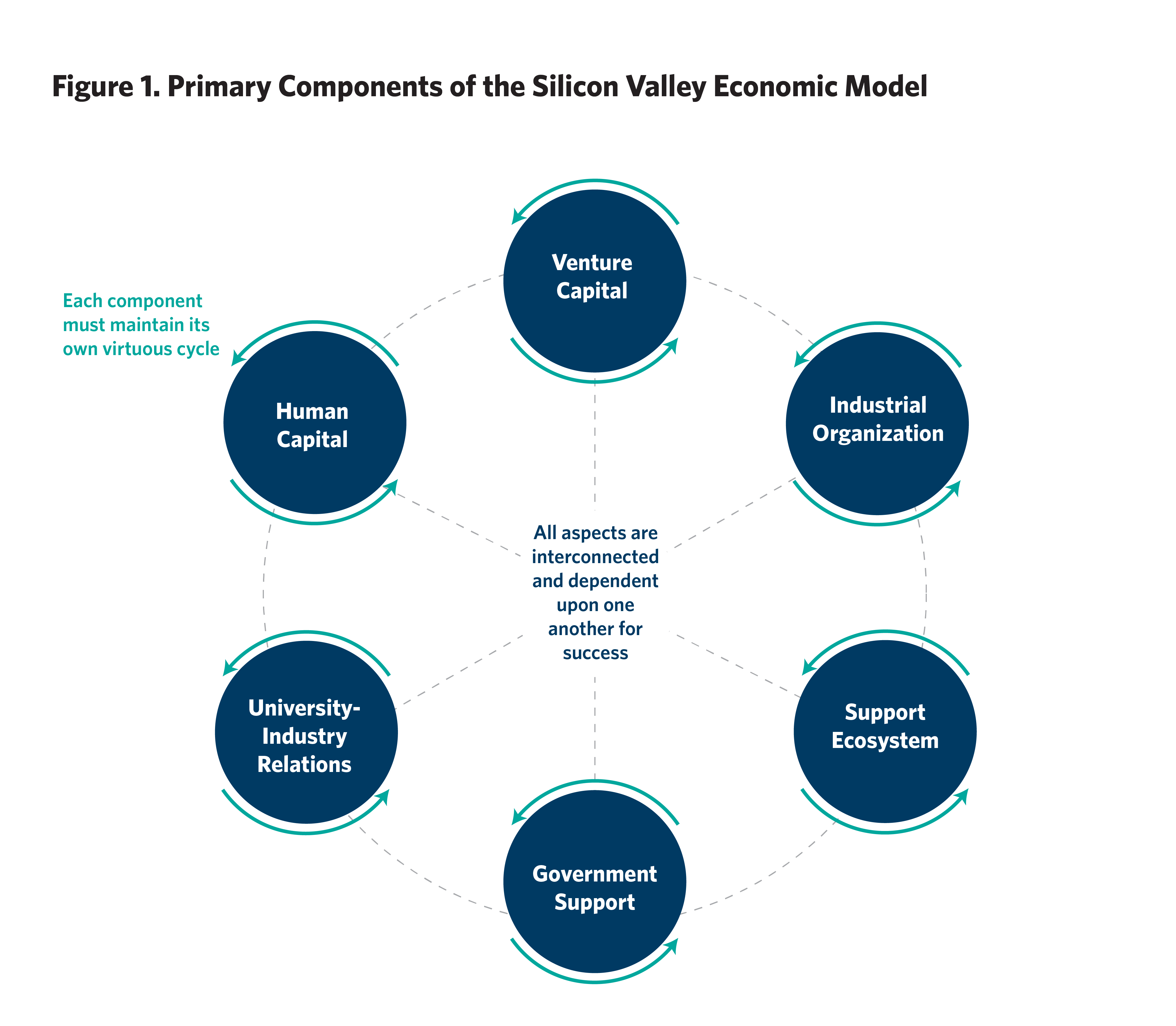 - It can be distilled into its primary components: (1) venture capital, (2) human capital, (3) university-industry ties, (4) direct and indirect government support, (5) industrial structure, and (6) support ecosystem of professional service firms.